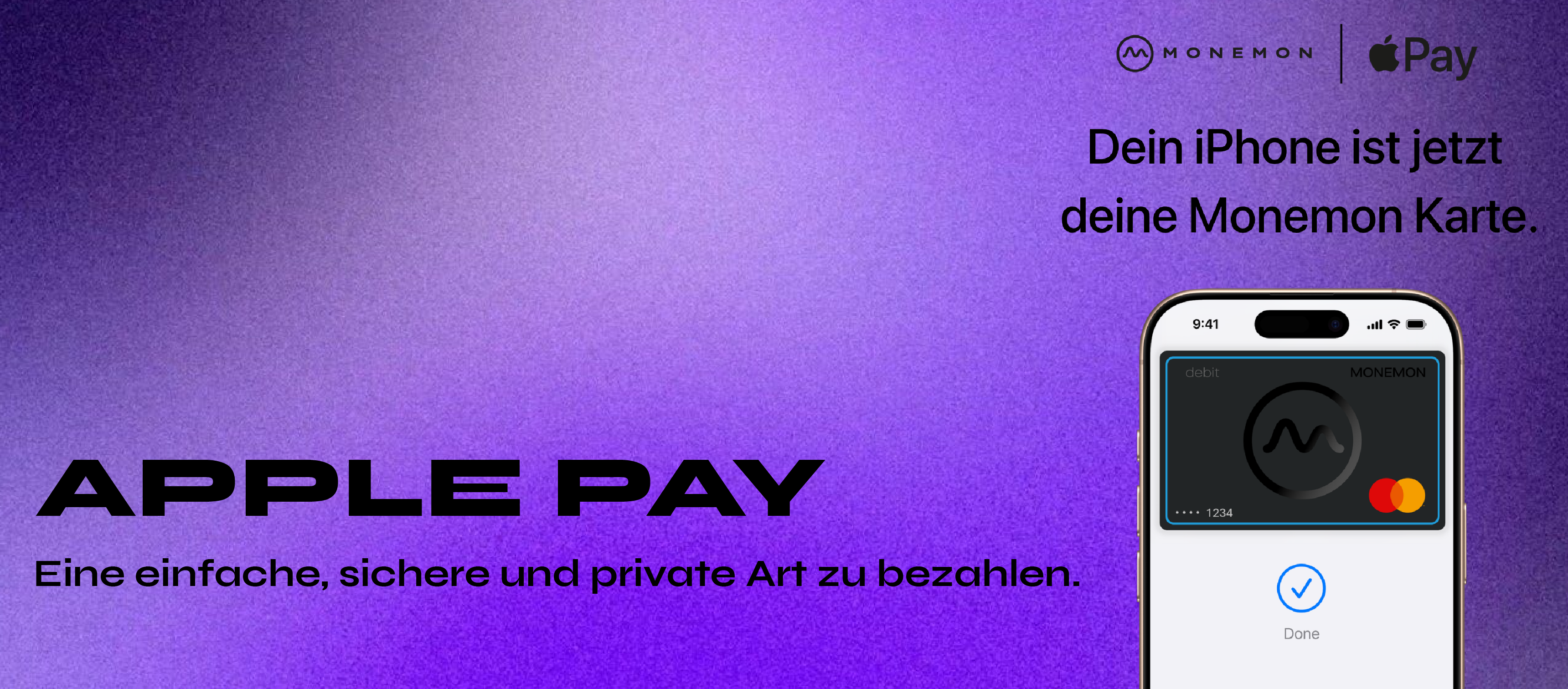 Kein Wallet? Kein Problem. Lass dein Wallet einfach zuhause. Mit Apple Pay zahlst du mit deiner Monemon Card direkt über dein iPhone oder deine Apple Watch. Schnell, easy und ready für unterwegs. | |